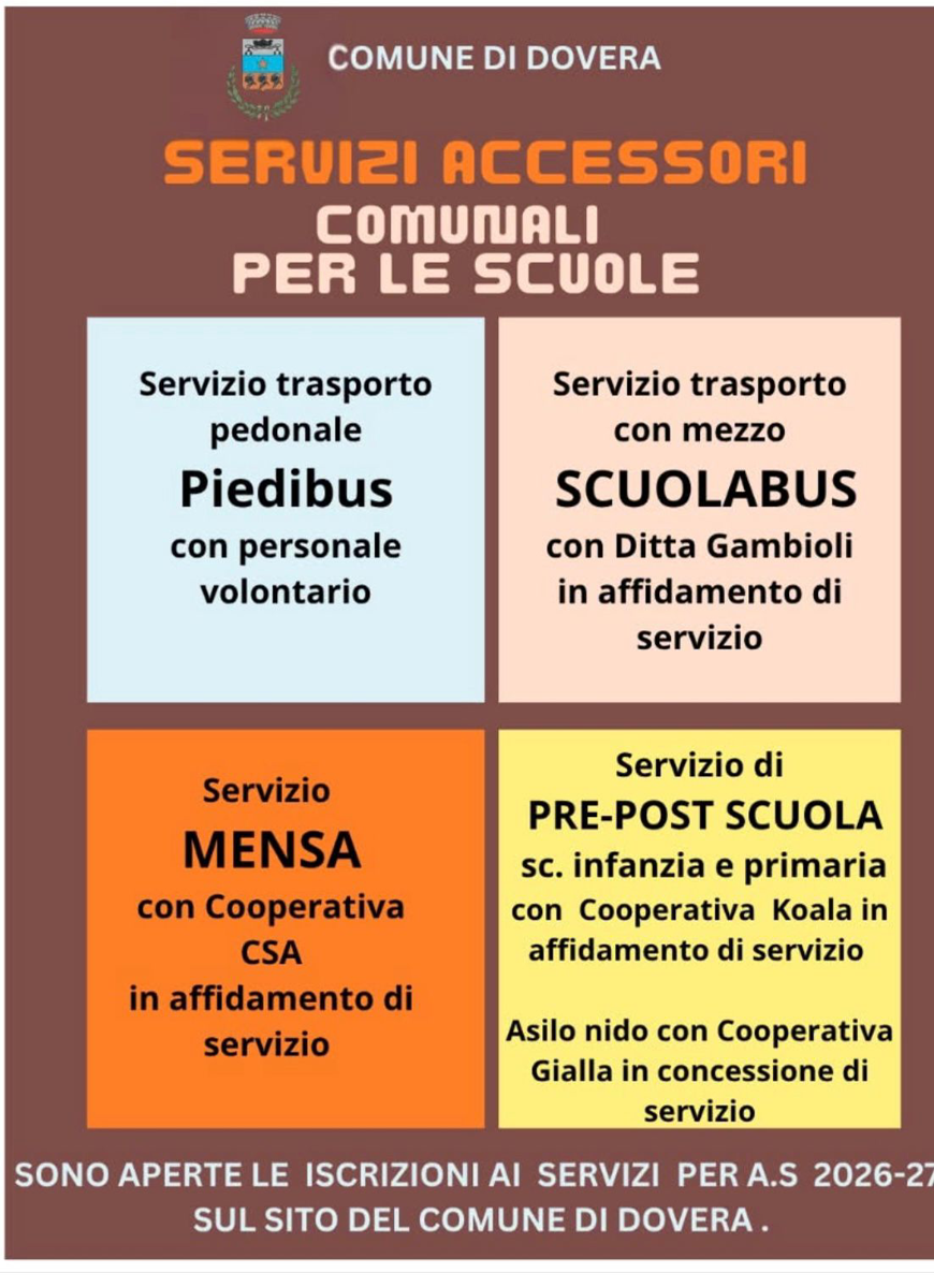 Iscrizioni ai servizi scolastici comunali: Piedibus, trasporto con scuolabus, mensa, post scuola per infanzia e primaria, Asilo nido. Iscrizioni aperte sul sito del comune di Dovera.