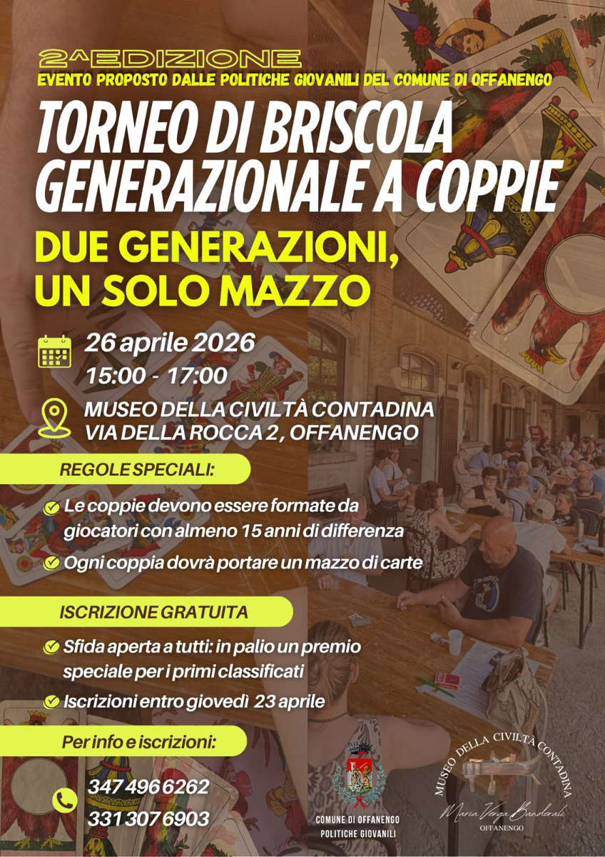 Sfida a coppie tra due generazioni (almeno 15 anni di differenza tra i compagni). Ogni coppia deve portare un mazzo di carte. Evento aperto a tutti con premio speciale per i primi classificati. Iscrizioni gratuite entro giovedì 23 aprile.