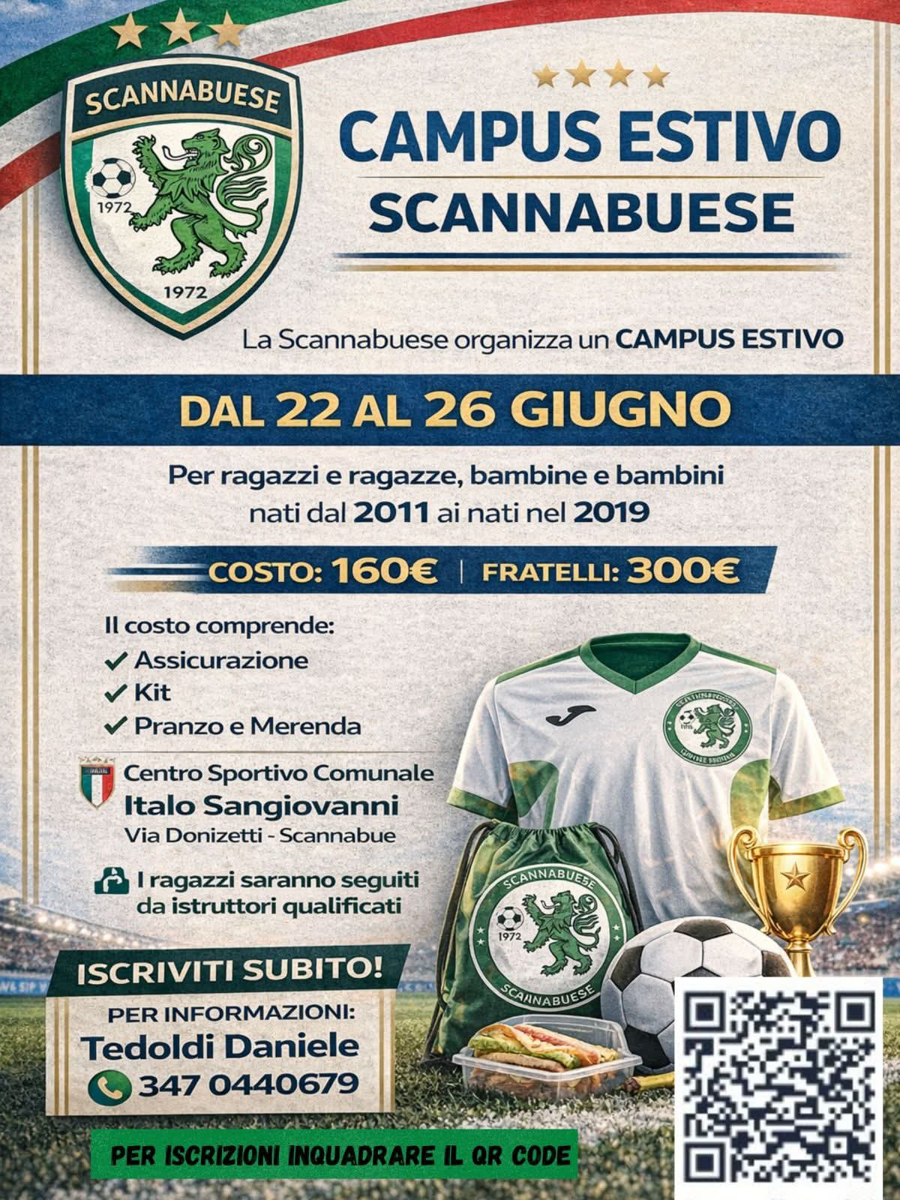Campus estivo organizzato dalla Scannabuese per bambini e ragazzi nati dal 2011 al 2019. Il costo comprende assicurazione, kit, pranzo e merenda. Attività con istruttori qualificati.