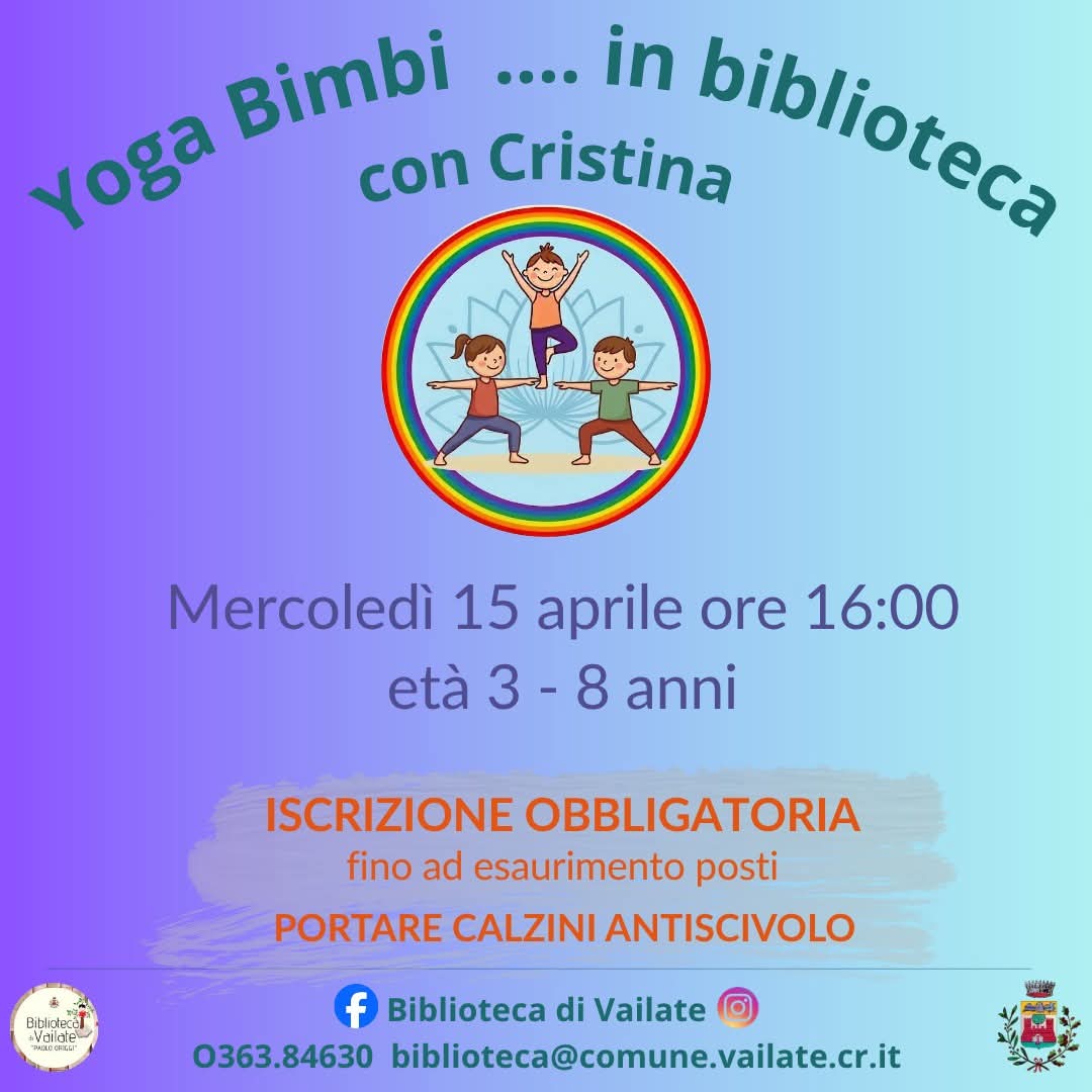 Attività di yoga per bambini 3–8 anni in biblioteca. Iscrizione obbligatoria fino ad esaurimento posti. Portare calzini antiscivolo.