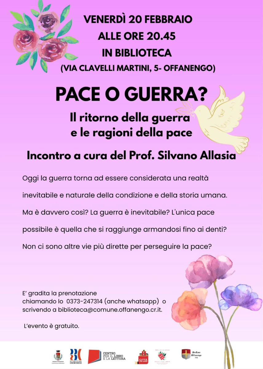 Incontro a cura del prof. Silvano Allasia sul ritorno della guerra e le ragioni della pace; riflessione sulla presunta inevitabilità della guerra e sulle vie per perseguire la pace.