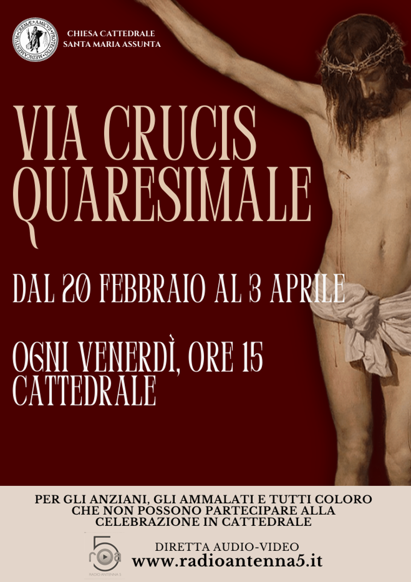 Celebrazione della Via Crucis in cattedrale. Diretta audio‑video su radioantenna5.it per chi non può partecipare in presenza.