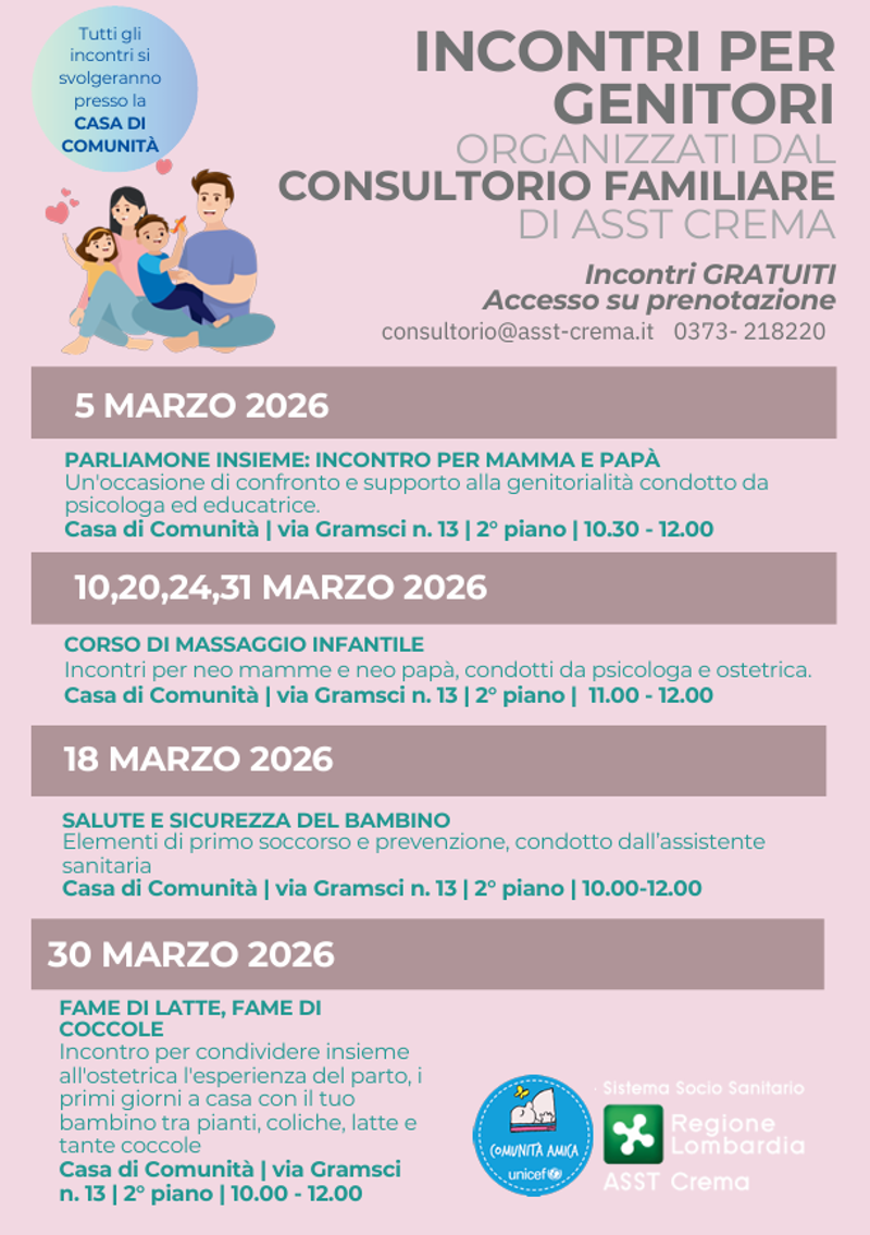 Info e prenotazioni: consultorio@asst-crema.it - 0373 218220