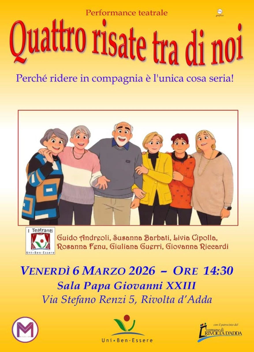 Performance teatrale a cura de I Teatranti (Uni-Ben-Essere). “Perché ridere in compagnia è l’unica cosa seria!”. Con Guido Andreoli, Susanna Barbati, Livia Cipolla, Rosanna Fenu, Giuliana Guerri, Giovanna Riccardi.