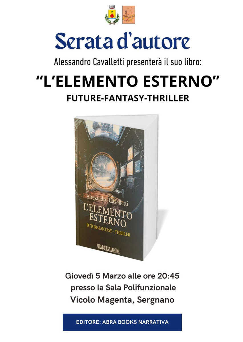 Presentazione del libro “L’Elemento Esterno”, un future‑fantasy‑thriller, con l’autore Alessandro Cavaletti. Editore: Abra Books Narrativa.