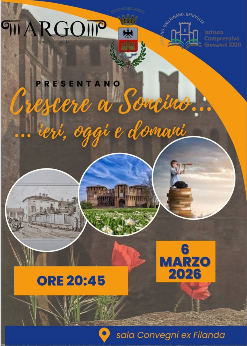 Serata dedicata a Soncino tra passato, presente e futuro, presentata da Argo, Città di Soncino e Istituto Comprensivo Giovanni XXIII.