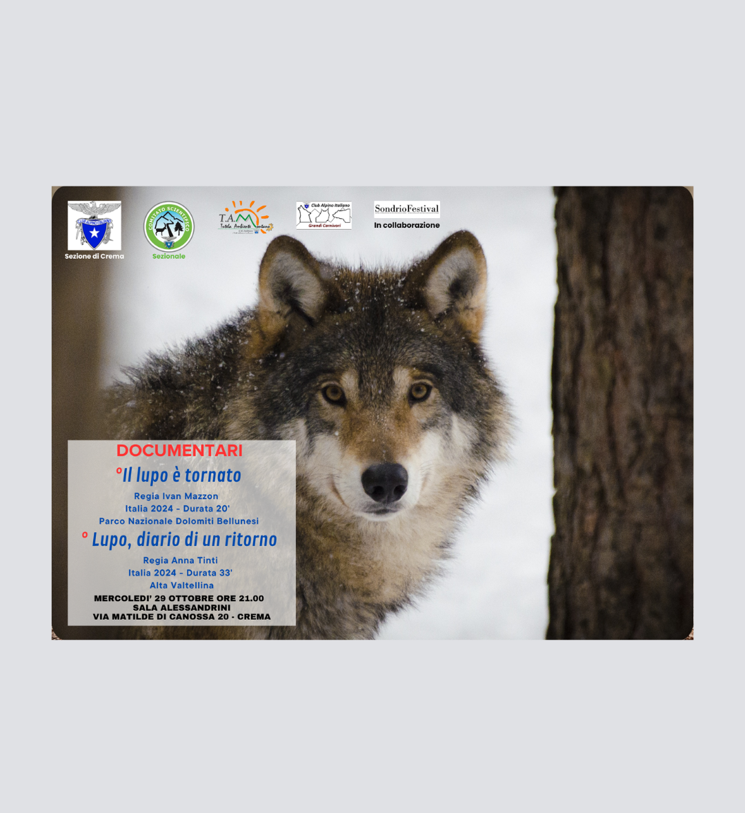 Proiezione di due documentari sul lupo: “Il lupo è tornato” (regia di Ivan Mazzon. 20 minuti) e “Lupo, diario di un ritorno” (regia di Anna Tinti, 33 minuti).