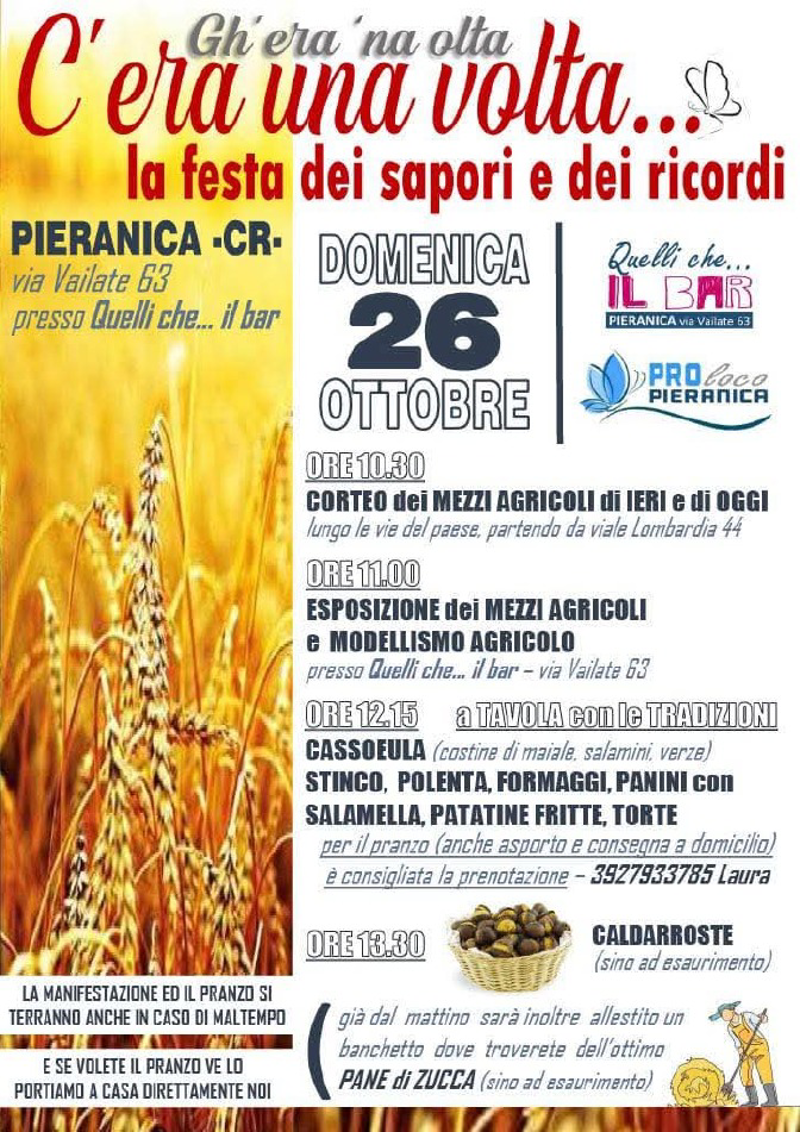 Programma: 10:30 corteo dei mezzi agricoli di ieri e di oggi lungo le vie del paese. Partenza da viale Lombardia 44. 11:00 esposizione di mezzi agricoli e modellismo presso il bar. 12:15 pranzo A tavola con le tradizioni: cassoeula, stinco, polenta, formaggi, panini con salamella, patatine fritte, torte. Dalle 13:30 caldarroste.