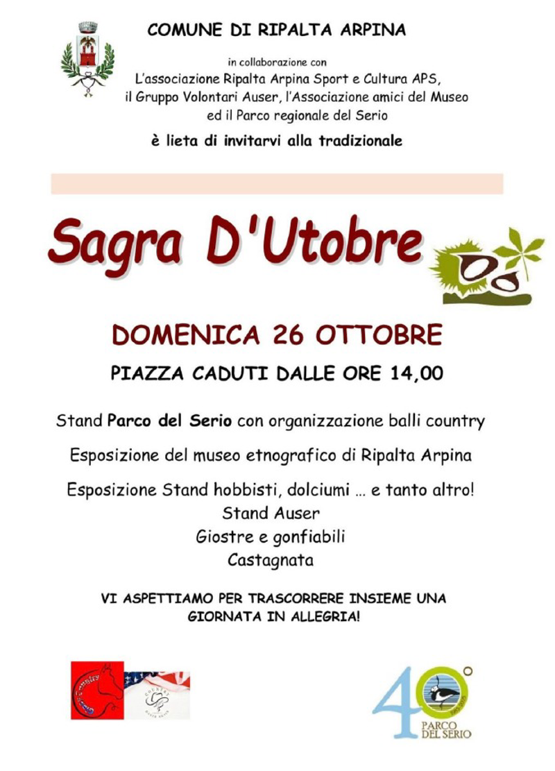 Stand del parco del Serio con balli country; esposizione del museo etnografico di Ripalta Arpina; stand di hobbisti e dolciumi; stand Auser; giostre e gonfiabili; castagnata.