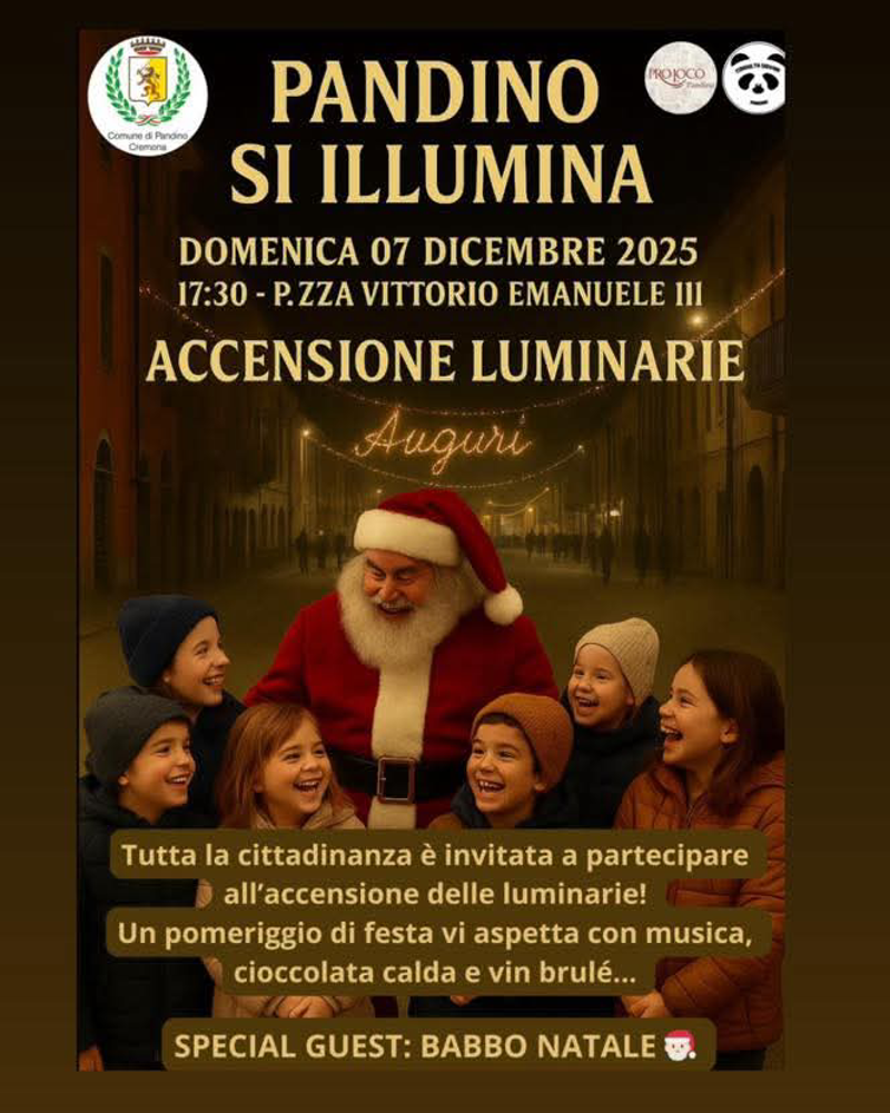 Accensione delle luminarie con festa in piazza: musica, cioccolata calda e vin brulé. Tutta la cittadinanza è invitata. Special guest: Babbo Natale.