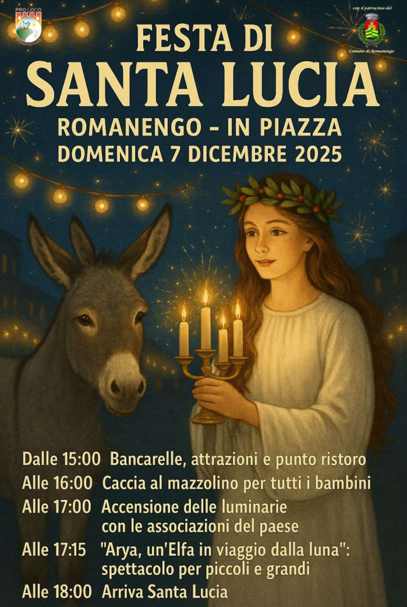 Dalle 15:00 bancarelle, attrazioni e punto ristoro. Alle 16:00 caccia al mazzolino per tutti i bambini. Alle 17:00 accensione delle luminarie con le associazioni del paese. Alle 17:15 “Arya, un’Elfa in viaggio dalla luna”, spettacolo per piccoli e grandi. Alle 18:00 arriva Santa Lucia.