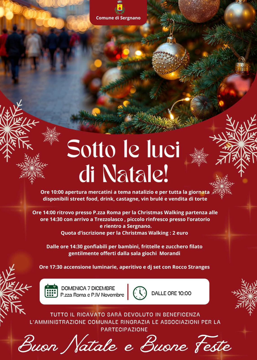 Mercatini natalizi con street food, drink, castagne, vin brulè e vendita di torte per tutta la giornata. Ore 14:00 ritrovo in Piazza Roma per la Christmas Walking; partenza ore 14:30 con arrivo a Trezzolasco, rinfresco in oratorio e rientro a Sergnano. Dalle 14:30 gonfiabili per bambini, frittelle e zucchero filato offerti dalla sala giochi Morandi. Ore 17:30 accensione delle luminarie, aperitivo e DJ set con Rocco Stranges.