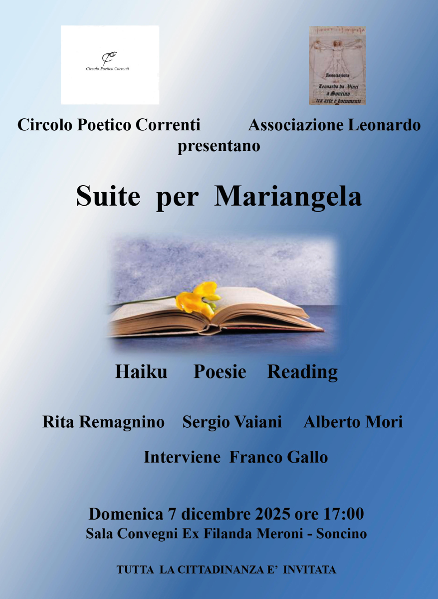 Haiku, poesie e letture con Rita Remagnino, Sergio Vaiani e Alberto Mori. Intervento di Franco Gallo. A cura del Circolo Poetico Correnti e dell’Associazione Leonardo.