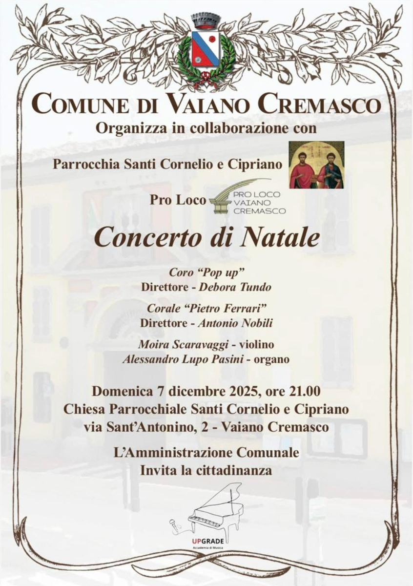 Concerto con il Coro "Pop up" diretto da Debora Tundo e la Corale "Pietro Ferrari" diretta da Antonio Nobili, con Moira Scaravaggi (violino) e Alessandro Lupo Pasini (organo). Evento organizzato dal Comune di Vaiano Cremasco con la Parrocchia Santi Cornelio e Cipriano e la Pro Loco.
