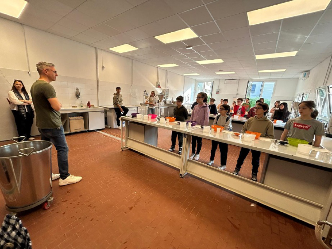 Un sentimento provato anche stamattina, quando l’istituto di via Bovis ha ufficialmente inaugurato il suo nuovo laboratorio polifunzionale con la visita di un gruppo di venti ragazzi dell’unità pastorale San Giacomo-San Bartolomeo di Crema che si sono messi in gioco con l’unico e originale progetto della scuola Casearia ideato per far vivere l’esperienza della trasformazione del latte in formaggio.