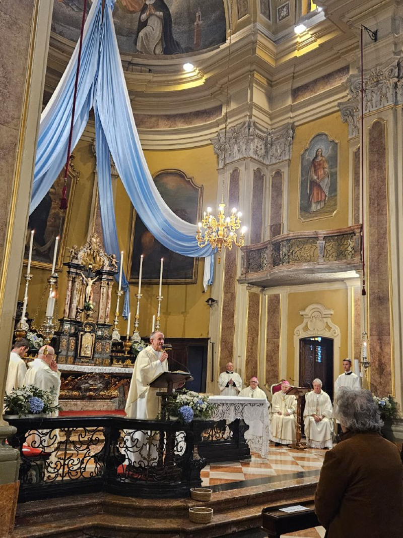 All'inizio della celebrazione don Marco Leggio ha salutato i presenti ed i festeggiati leggendo il telegramma pervenuto dalla Santa Sede con l'augurio, il saluto e la benedizione di papa Leone a firma del cardinal Pietro Parolin, segretario di Stato, ed ha presentato il dono della comunità ai due “Cinquantenni”: due dipinti dell'agnadellese Daniele Gallarati, uno –quello donato ad Ariotti- raffigurante la chiesetta della frazione Sant'Antonio, l'altro -per don Merisi- raffigurante la chiesa parrocchiale.