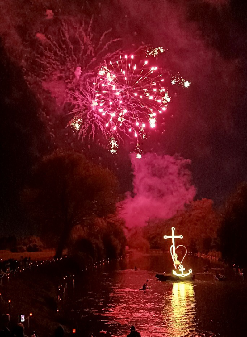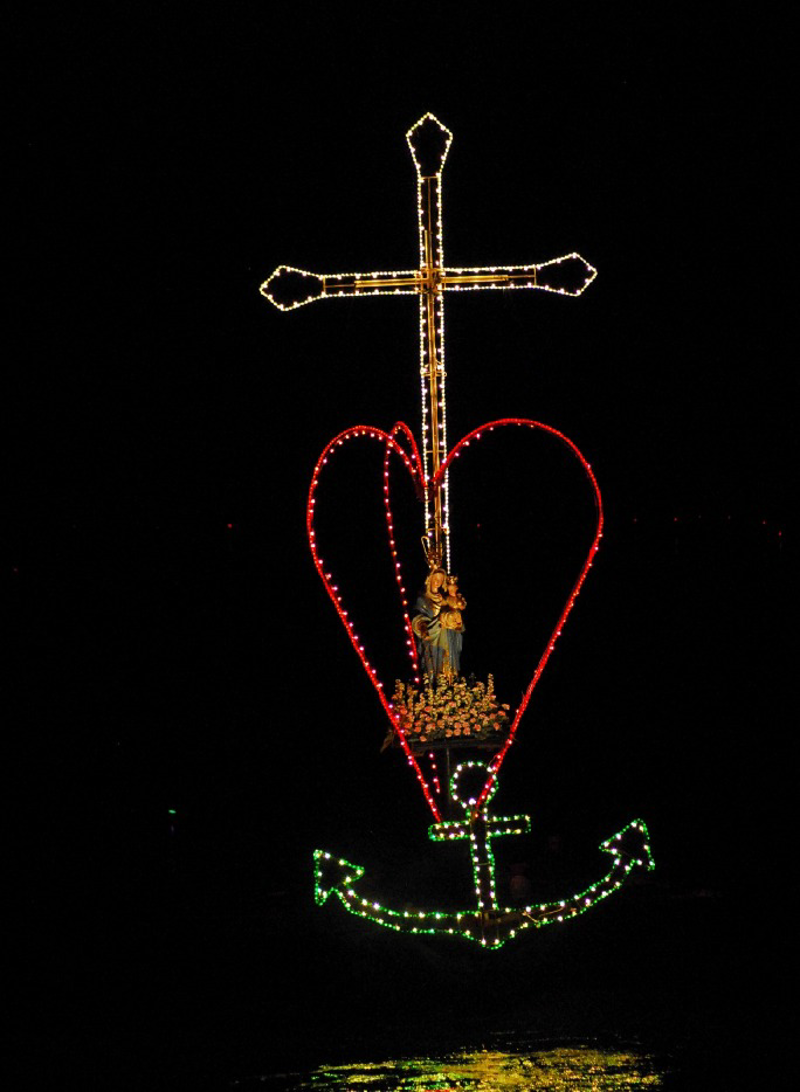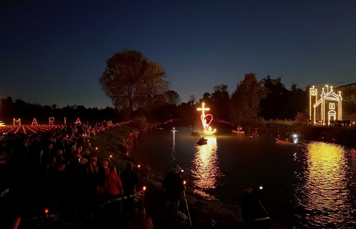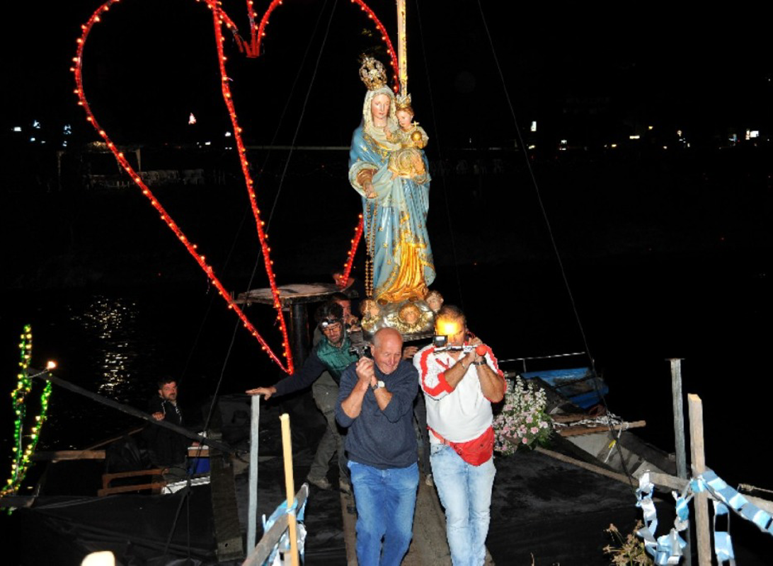 Il momento culminante della processione mariana: l’imbarcazione illuminata con la statua della Madonna scesa lungo le acque del fiume Serio e i fuochi d’artificio finali.