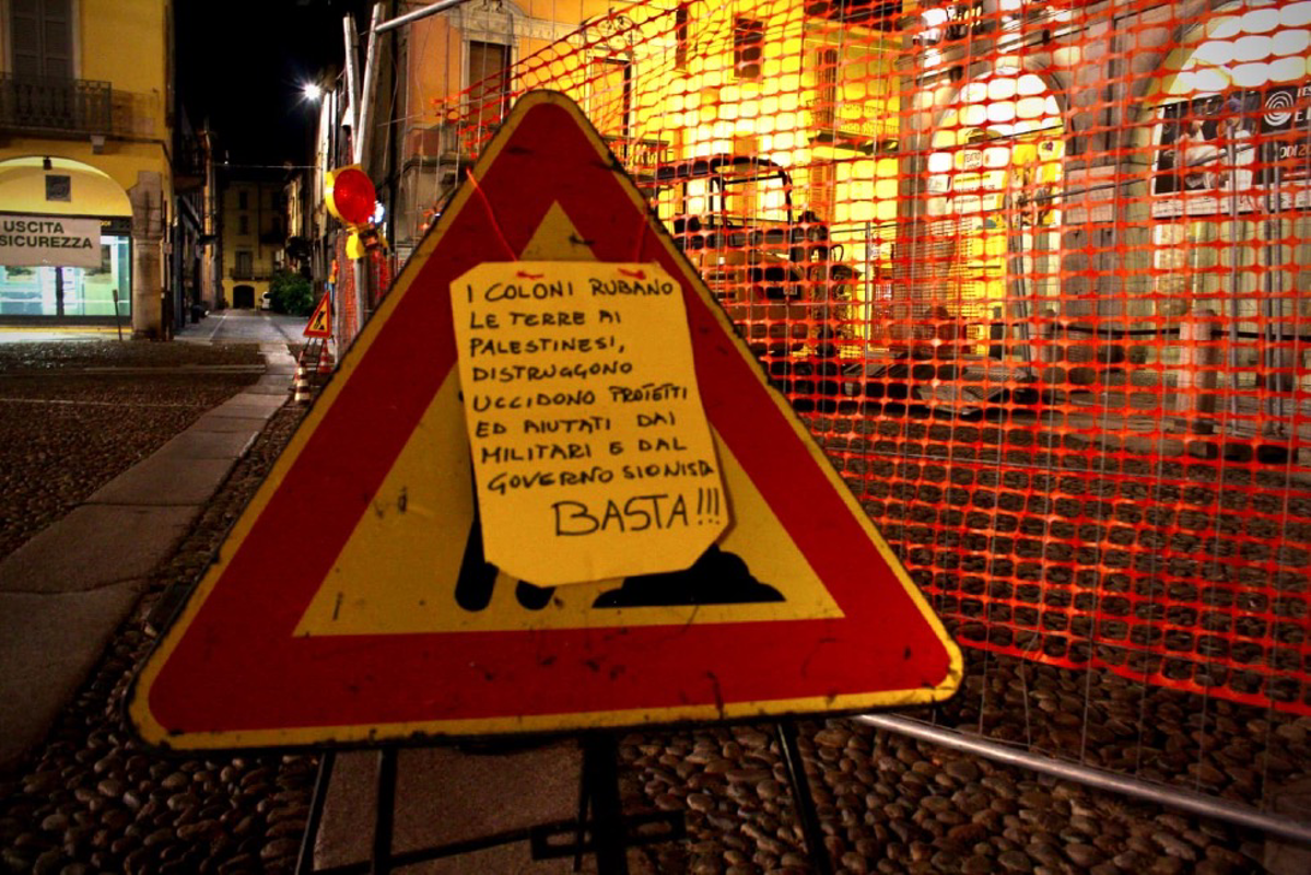 (Luca Raimondi Cominesi) Davanti al Duomo, sul cartello di segnalazione dei lavori in corso, è comparso un foglio con un messaggio di protesta: “I coloni rubano le terre ai palestinesi, distruggono, uccidono, protetti ed aiutati dai militari e dal governo sionista. Basta!”.