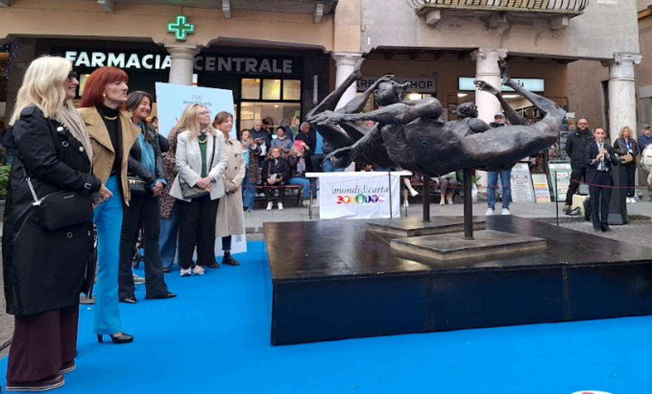 Taglio del nastro per I Mondi di Carta con lo svelamento della scultura simbolo di questa tredicesima edizione ispirata al tema Voltando pagina.