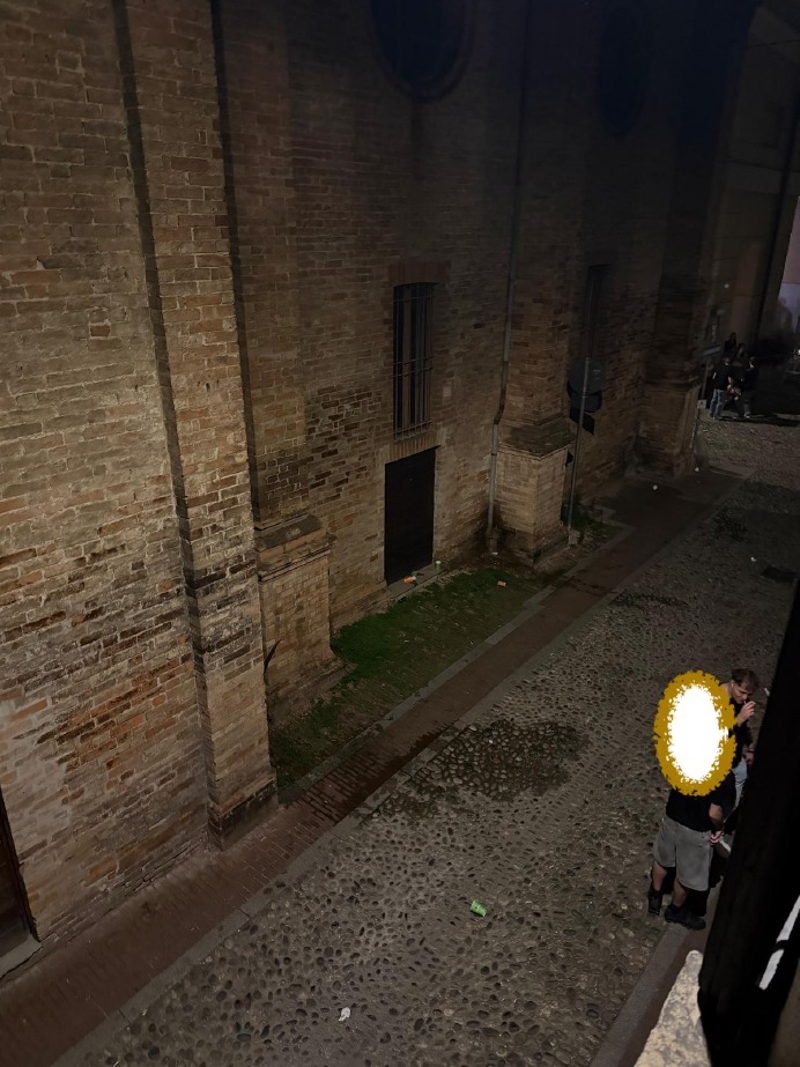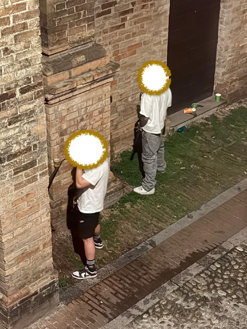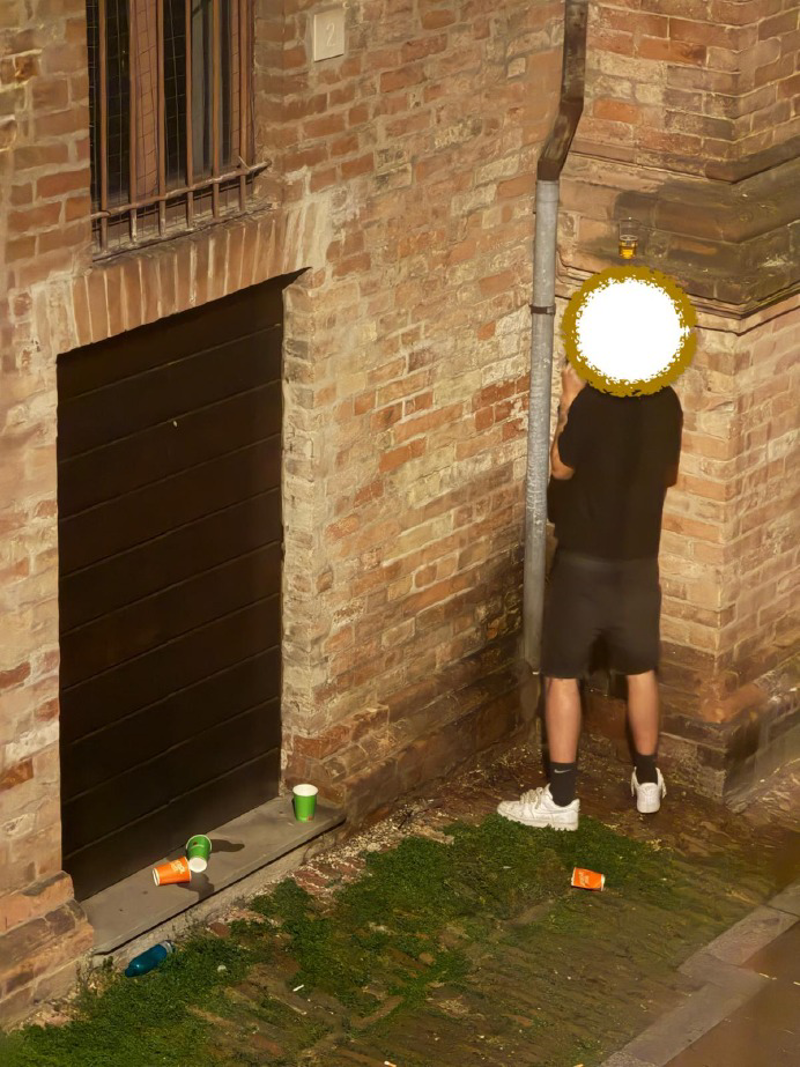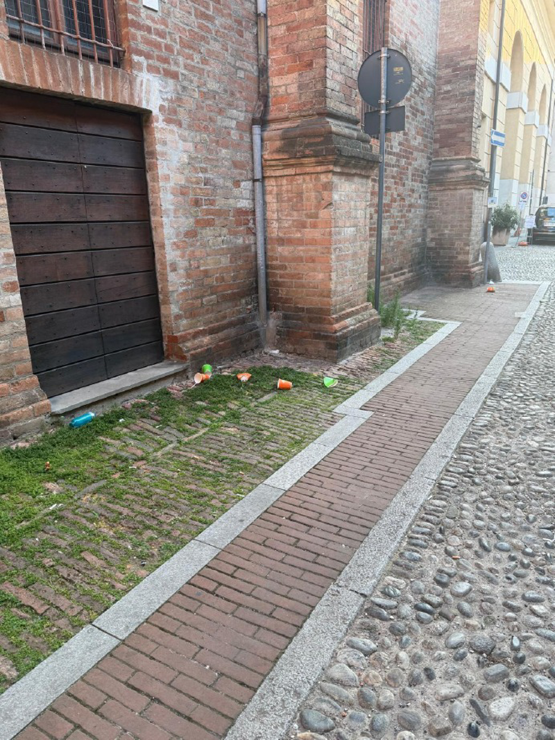E' notte e invece di tornare a casa qualcuno, più di uno, preferisce bighellonare per la piazza, dopo una serata probabilmente ad alto tasso alcolico. E quando scappa... cosa c'è di meglio dei muri dell'ex chiesa e quelli dell'antico palazzo. E cosa c'è di meglio che spargere cartacce e rifiuti per tutta via Lucini, come se non vi fosse un domani.
