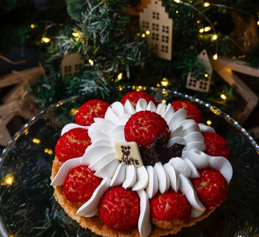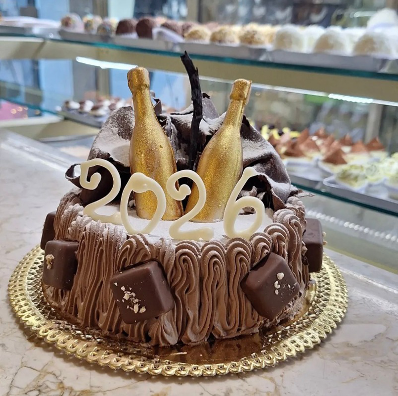 La giovane pasticcera Elisa Tomasini di Dolce Torte ( piazza Marconi) ha pensato ad una stupenda ed elegante Saint Honorè 20..26, “Dolce Capodanno”: base di pasta sfoglia, pan di Spagna farcito con crema pasticcera, pasticcera al cioccolato e composta di lampone. In superficie gli immancabili bignè farciti (di colore rosso) intervallati dalla golosa panna montata.