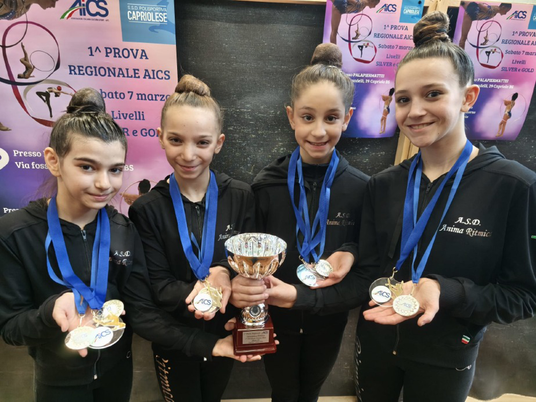 (Gianluca Maestri) Prima prova regionale di ginnastica ritmica Aics ieri a Capriolo per l’asd Anima Ritmica Sergnano, scesa in pedana con 32 ginnaste che hanno conquistato 15 podi con 7 medaglie d'oro, 3 d’argento e 5 di bronzo.